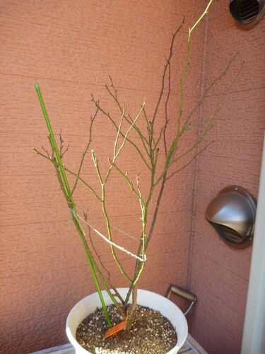 あらためて、枝だけになった姿を見ると、シュートが箒形に育ってしまったということがわかります。 下の方に良い芽があれば、ばっさりいくのですが、残念ながらありませんでした。 1本元気のない枝を下から切った以外は、基本的に、細い枝を全て切り落として…