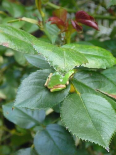verandarosegarden.hatenablog.com あれ以来、いろんなバラの葉の上で休んでいる姿を見たが、昨日は Republique de Monmartreの葉の上にじっとしていた。 僕の方は、隣のアプリコットキャンディの 葉が黄変したものを取り除いたり、カイガラムシの除去、茎の…