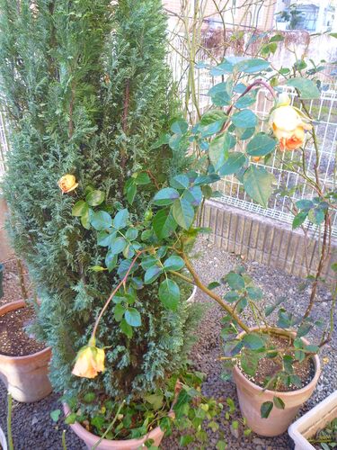 こんな感じの蕾がいくつかあったのですが、ばっさりしました。 けっこう細い枝に、大きめな花をつけるので、絶対下向きに咲いてしまう。春くらい太い枝に咲かせたいので、細い部分を切り捨てたら、枝があまりなくなってしまったという感じに…。 昨年、コガネ…