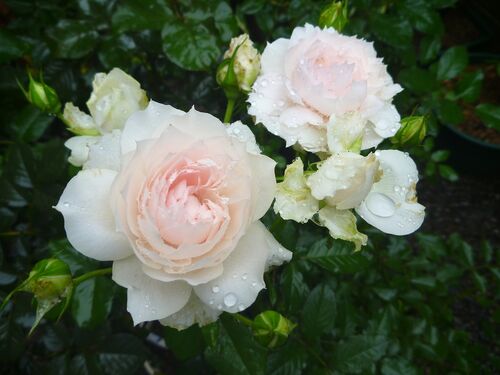 まずは、シャリマー。 2本出た、ベーサルシュートの先に、房状になって蕾がつき、それが開花しだしました。雨が断続的に降り続く中なので、香りはかすかです。 ちなみに、このシュートは60と80センチ程度の伸びで開花しましたので、カタログにある通り鉢植え…
