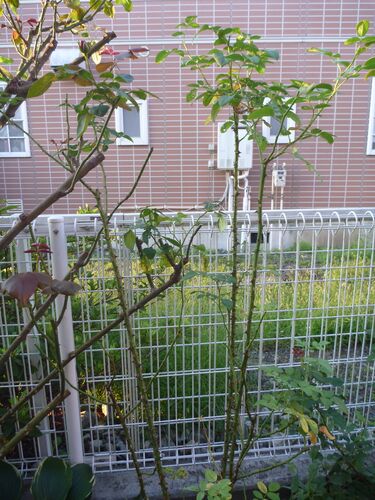 先日、ノヴァーリスの初秋の剪定をしたときにはこんな枝はなかったのですが、しその写真を撮っているときに、気が付きました。 よくよく、株元の方へ枝を追っていって見ると、リヴェールにたどり着きました。 サイドシュートなのですが、なんちゃって誘具に…